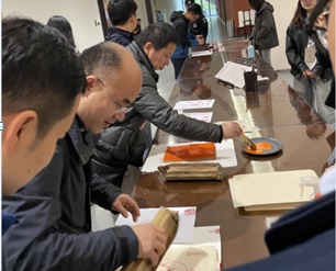 惟殷先人,有册有典。古籍,是中华民族历史和文化遗产的重要组成部分,记载着中华文明的演进历程,凝结着华夏民族的文脉根基和精神血脉。本次展览是“册府千华”系列展首次进入西部高校,展厅面积950余平方米,展出精品古籍200余件,其中不少是进入《国家珍贵古籍名录》及《四川省珍贵古籍名录》的善本。党员教师们在讲解员的带领下,以时间脉络演变为线,欣赏了包括唐敦煌写卷《大般若波罗蜜多经》、宋刻元修本《晦庵先生文集》、明内府抄本《永乐大典》、清乾隆初彩绘本《四川全图》、清乾隆南三阁四库全书本《平定两金川方略》、国学大师章太炎手稿《小学答问》、文征明、李攀龙、曾国藩、张之洞等名家墨迹、杨啸谷旧藏古纸等经典古籍。参观过程中,党员教师对纸张的制作工艺与分类,书籍版本与装帧的历史发展,及其风格特点也有了深入了解。参观最后,党员教师们沉浸式体验了毛笔书写,书籍拓印等活动。