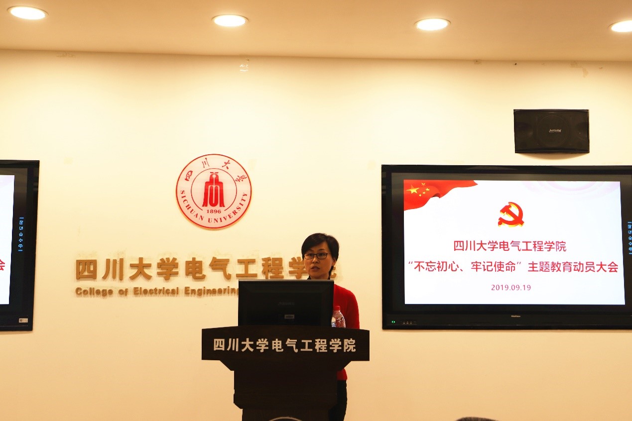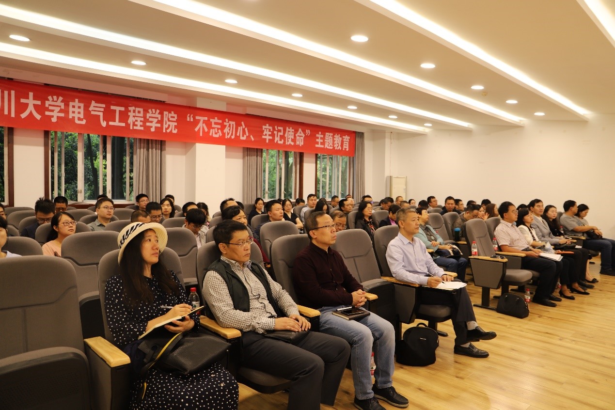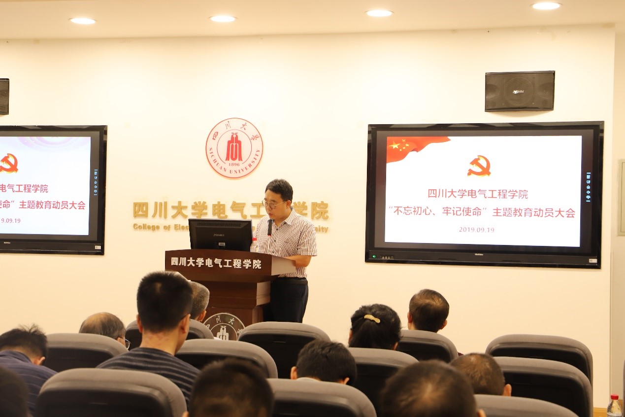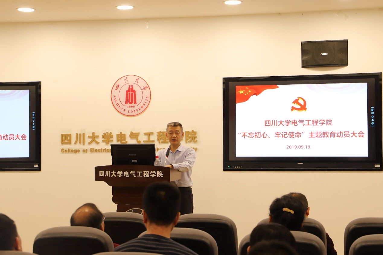 2019年9月19日上午,电气工程学院“不忘初心、牢记使命”主题教育动员大会在望江校区基础教学楼B座206会议室举行。学校主题教育第五指导组组长李栓久出席会议并讲话,指导组全体成员到会指导。学院班子全体成员、两委委员、全体在职教职工党员、离退休党员代表、学生党支部书记以及部分学生党员参会。会议由院长肖先勇主持。