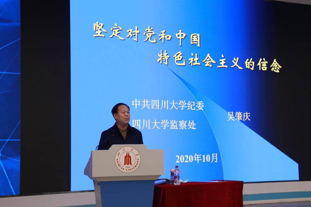 当天下午两点,原四川大学纪委副书记吴肇庆为学员们讲授了“坚定信念”专题党课。首先吴肇庆老师以老一辈共产党人的生动事例阐释了党的信念的丰富内涵,强调了当代青年树立对理想信念的重要性。接着,吴肇庆老师通过分析当今国际环境和国际政治斗争带来的影响,加深学员们对于理想、信念及改革开放等问题的认知。最后,吴肇庆老师从四个方面讲述了如何在学习与实践中坚定对中国共产党和中国特色社会主义的信念,引导学员们要学习贯彻好中国特色社会主义理论和思想,在新时代多参加社会实践,坚定热爱党、祖国和中华民族的信念。