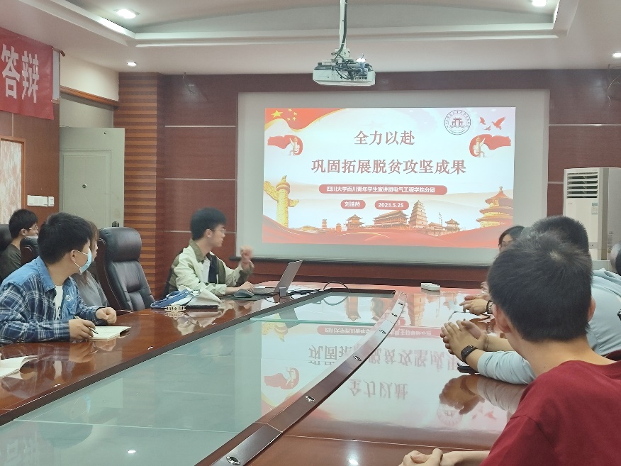 随后,四川大学百川青年学生宣讲团电气工程学院分团的刘浩然同学应邀以“全力以赴巩固拓展脱贫攻坚成果”为主题为支部党员们作报告。他首先强调全面建设社会主义现代化国家的重要性,通过生动的案例和实际经验,分享了脱贫攻坚工作中的成功实践和宝贵经验,并号召大家以身作则,积极投身到巩固拓展脱贫攻坚成果同乡村振兴有效衔接的工作中,为实现中华民族伟大复兴贡献自己的力量。
