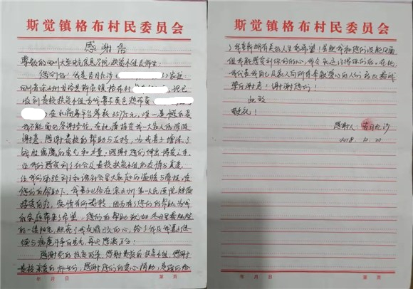 “感谢贵校的帮助与支持,为我妻子增添了战胜病魔的勇气和力量;感谢您们深出的博爱之手,让我们感受到了社会及贵校扶贫小组的友情与真爱,让我们体验到了温暖与牵挂。”红沙在信中表达了他对学院无私帮助衷心的感谢。
