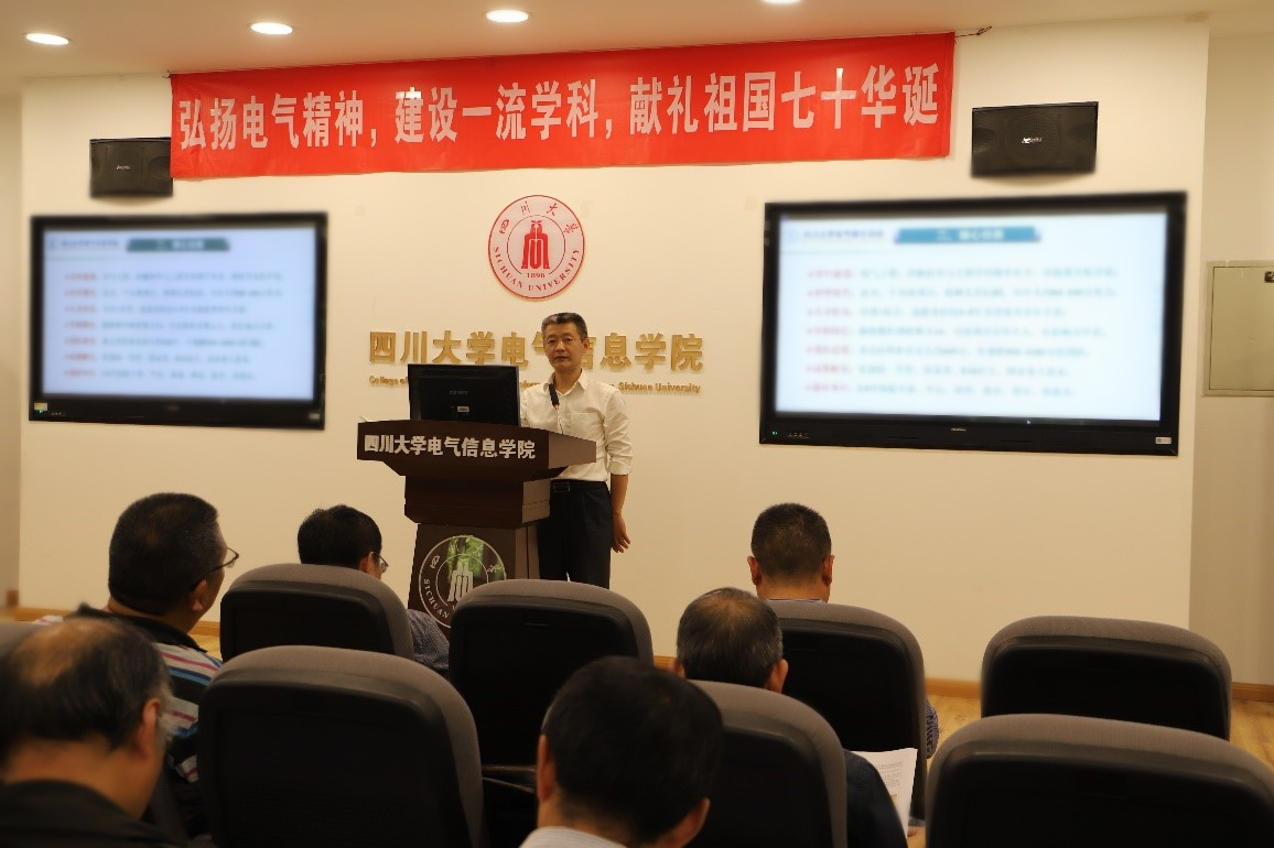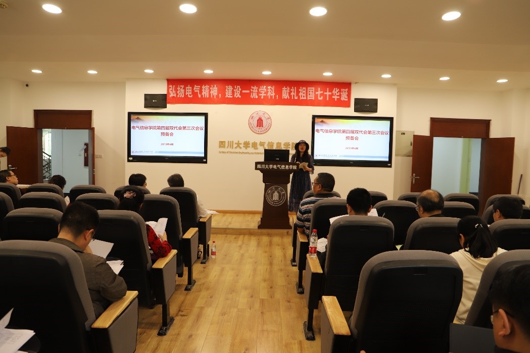 2019年4月19日下午,电气信息学院第四届“双代会”第三次会议暨2019年度工作布置会在望江校区基础教学楼B206会议室胜利召开。学院双代会正式代表、特邀代表、列席代表,以及学院教授委员会、教指委委员等70余人出席了本次会议。本次会议的主题是“弘扬电气精神,建设一流学科,献礼祖国七十华诞”。