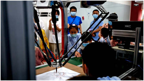在罗克韦尔自动化实验室,师生志愿者们播放了四川大学火锅战队参加“全国RM机甲大赛”的精彩视频,并现场进行了战斗机器人动作演示及操控体验、三臂机器人绘画等表演。