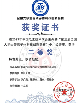 2023第三届全国大学生等离子体科技创新竞赛,二等奖(张广庆,2021级本科)