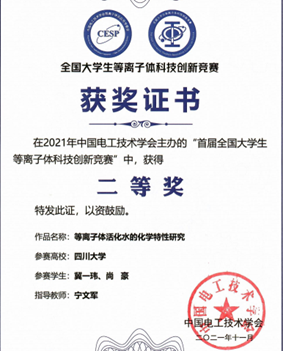 2021首届全国大学生等离子体科技创新竞赛,二等奖(冀一玮,2021级研究生)