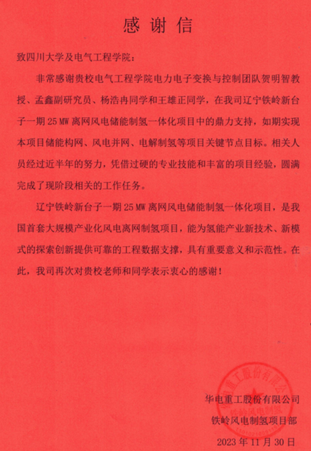 3.辽宁华电铁岭新台子一期25MW离网风电储能制氢一体化项目风电离网制氢系统能量管理平台开发,中国华电集团华电重工股份有限公司,结题。项目成功研发全球首套适用于25 MW离网风电制氢系统的能量管理平台及控制算法。该项目已于2024年4月20日投入商业化运营,并为2024年大连夏季达沃斯论坛使用的氢能公交提供绿氢。