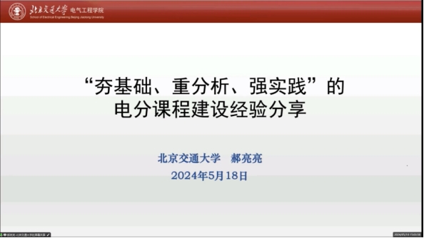 国家一流课程负责人北京交通大学郝亮亮副教授线上分享了“夯基础、重分析、强实践”的电分课程改革及建设经验,介绍了课程的基本情况、存在的共性问题、如何优化课程和自己的实践历程,并且分享了自己的微信公众号和教课视频资源供大家交流讨论。