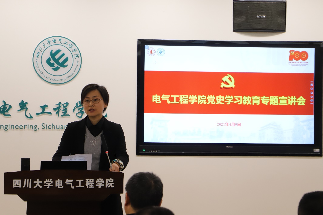 2021年4月9日下午,电气工程学院在望江基础教学楼B座206报告厅举行党史学习教育专题宣讲会,邀请四川大学党史学习教育宣讲团成员张洪松教授作宣讲报告。学院党委书记韩芳主持会议。学院全体教师党员和学生党支部书记100余人参加宣讲会。