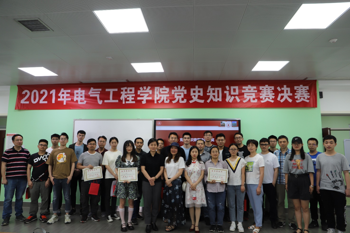 本次竞赛围绕习近平新时代中国特色社会主义思想、中国共产党发展史、新中国史、改革开放史、社会主义发展史等相关知识,设置团队必答题、抢答题、现场互动题等多个环节,抢答题包括线索题、识图题、音频题和视频题等,形式新颖、内容丰富。在必答环节,每支联队分别回答了随机分配的5道题目。参赛选手们准备充分,从容不迫,答题准确,所有题目均回答正确,赢得了满堂喝彩。激烈的竞争发生在抢答环节,选手们聚精会神,仔细聆听,伴随着主持人喊出“抢答开始”的口令,选手们反映敏捷,迅速按下抢答器,答题迅速准确,比分交替上升,紧张刺激的抢答题环节,使现场的气氛十分热烈。经过15道题目的抢答和附加题环节,2019级硕士第一党支部和电工电子中心党支部联队最终取得了全场最高分,获得决赛的集体一等奖,博士研究生党支部和电气信息工程研究与实验中心党支部联队、2020级硕士第一党支部和电气工程系党支部联队获得了二等奖, 2020级硕士第二党支部和自动化系党支部联队、本科生第三党支部和行政党支部联队获得了三等奖。此次决赛充分展示了学院师生学习党史的成果和积极向上的精神风貌。