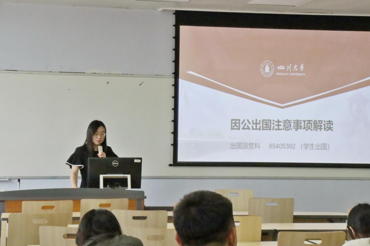 首先,程小钰老师介绍了四川大学学生因公出国的手续办理及相关注意事项,详细讲解了“四川大学学生出国(境)备案系统”的备案流程,特别强调了出国期间的注意事项及外事纪律,最后祝愿同学们在德国期间学习顺利,平安愉快。