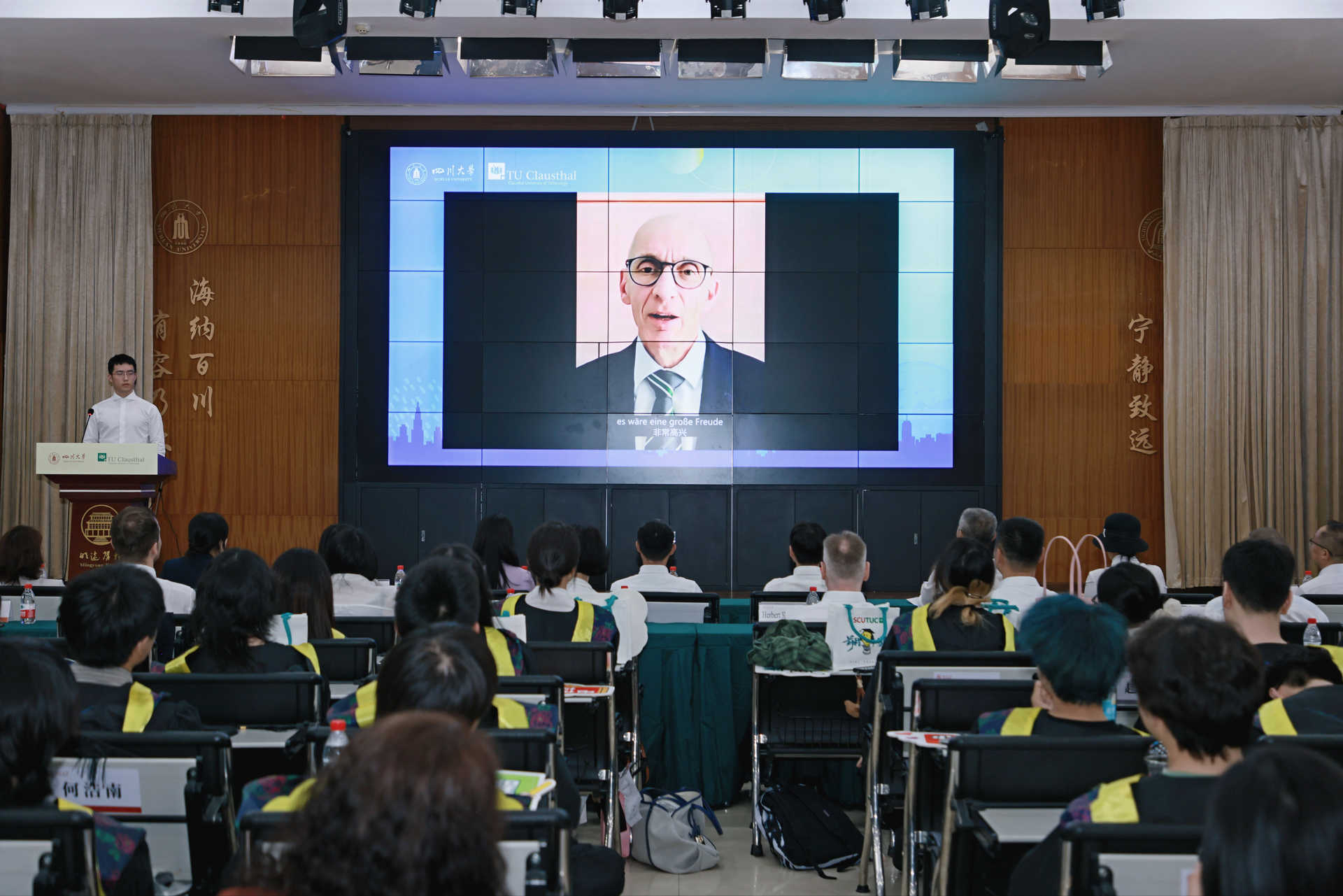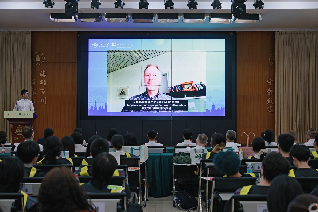 克劳斯塔尔工业大学副校长Stefan Hartmann、电气工程专业负责人Christian Rembe、中国事务专员兼中国能力中心主任侯正猛分别发表视频致辞。他们充分肯定了中德班首届毕业生的优秀表现,这不仅是个人的重要成就,也是双方国际合作中的一个里程碑。他们鼓励同学们在未来职业发展中不断追求卓越,勇于迎接挑战,保持开放与好奇心,同时对两校今后深化合作表达了良好祝愿,展现了两校长期友好的合作情谊。