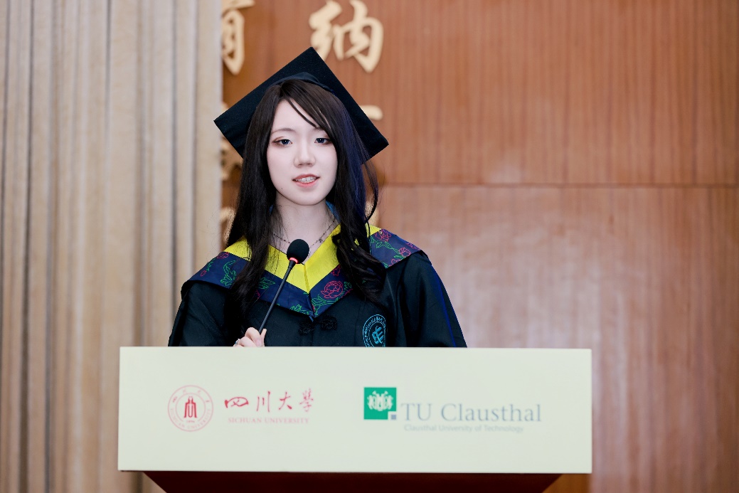 2025届中德班毕业生代表袁来同学发言,表达了对母校和师长们悉心培养的感恩之情,分享了在川大及克大的学习经历、文化融合的成长收获,并表示将牢记初心,砥砺奋进,在未来广阔的舞台上不断书写属于中德班毕业生的精彩篇章。