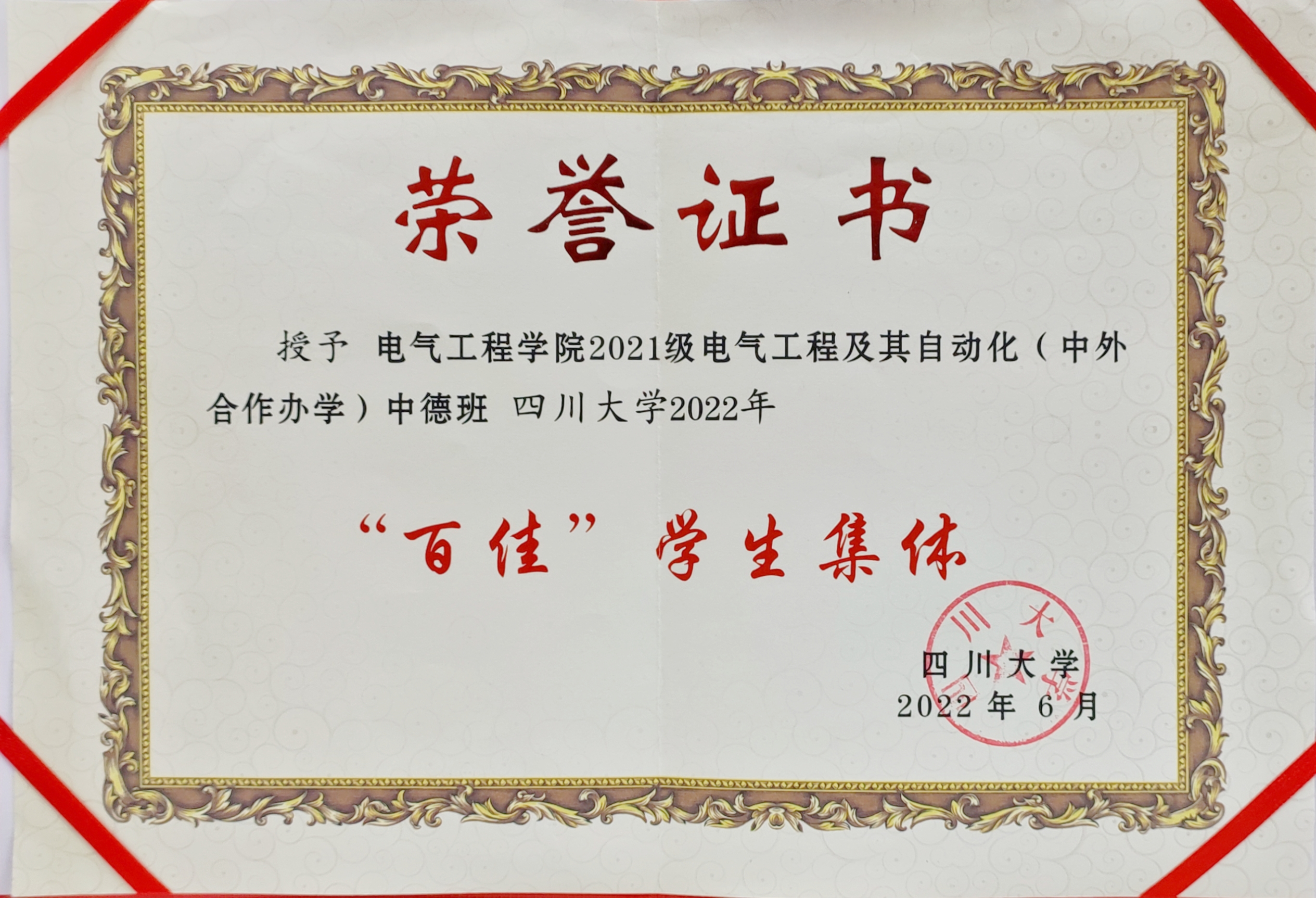 2022年6月,经集体申请,单位审核推荐,学校学工部、研工部、校团委共同组织评审,电气工程学院2021级中德班获评“四川大学2022年百佳学生集体”荣誉称号。