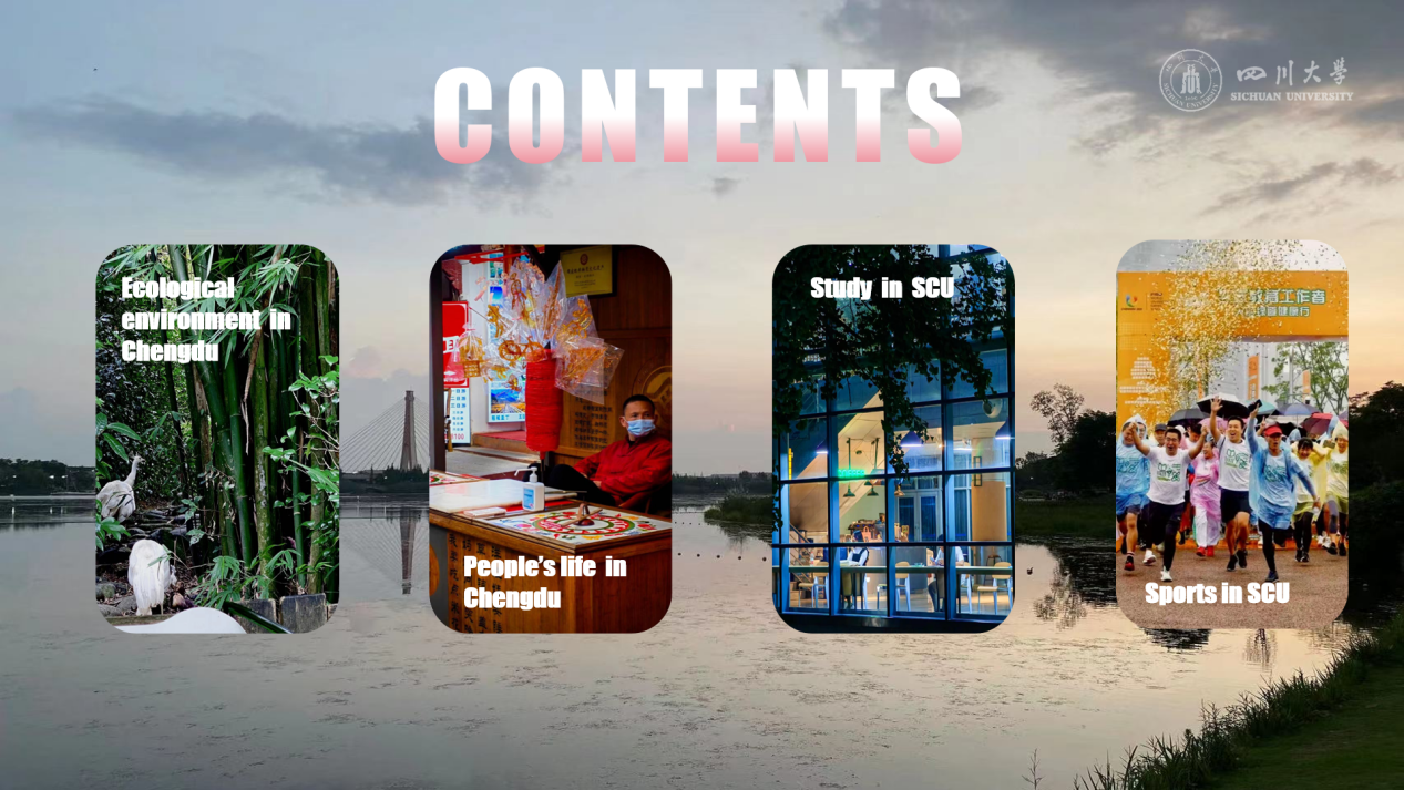 报告共分四个部分,涵盖了成都的生态环境与人文生活以及川大的学习生活和体育活动等内容,为大家展现了成都独特的文化魅力和发展活力以及丰富多彩的川大校园生活。