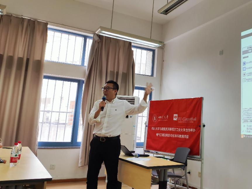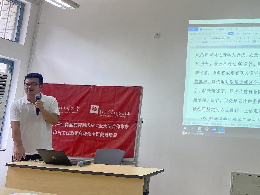 我院电气中德项目首届中德班学生将于今年暑期赴德国克大开始学习。2023年6月2日下午,2021级中德班“赴德学习及升学指导”主题班会在江安校区二基楼B103教室顺利举行。电气工程学院院长助理陈实,中德项目行政管理、辅导员老师及2021级中德班全体学生参加了本次班会。班会由中德项目辅导员朱愉田老师主持。