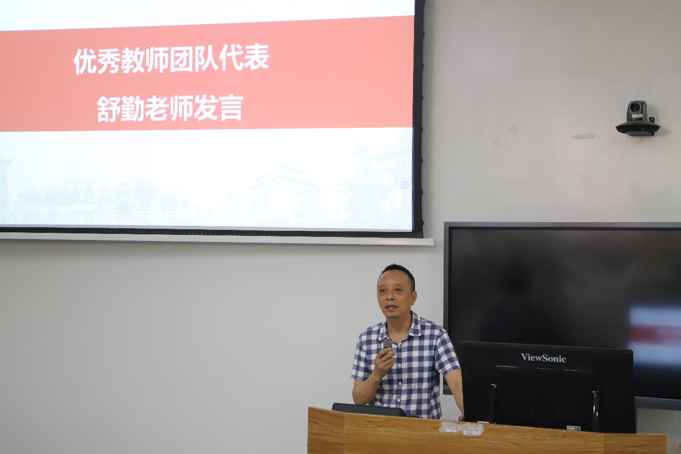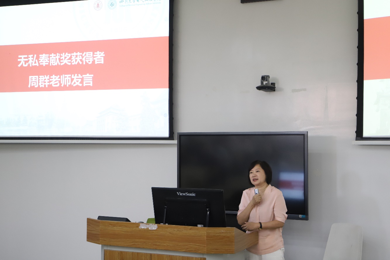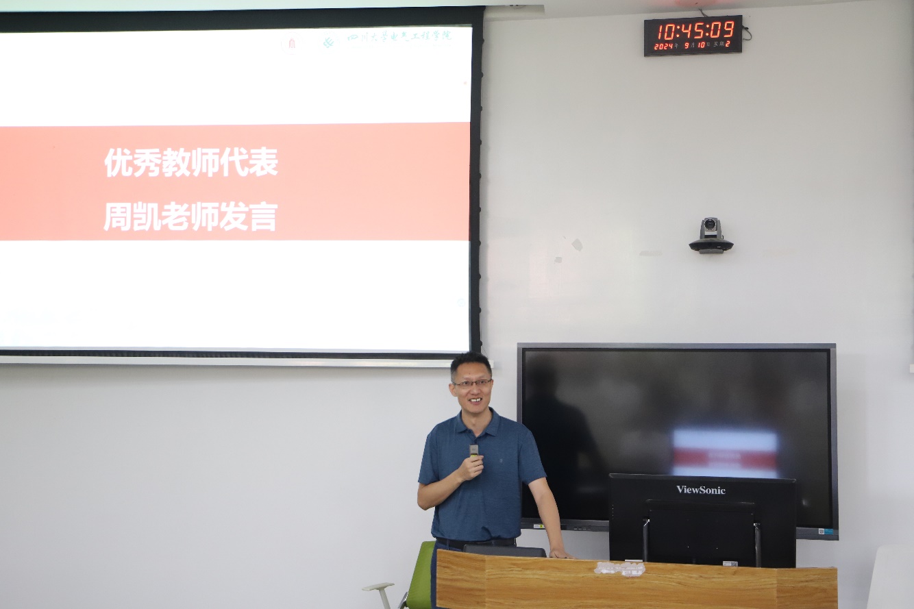 学校“姜维平优秀教学奖”获得者曾成碧教授、学院“优秀教师团队”代表舒勤教授、学院“优秀教师”代表周凯教授、学院“无私奉献奖”代表周群教授分别作了发言,他们分享了自己对教书育人事业的感悟、热爱与追求,表示将继续传承和弘扬一代代川大电气人的高尚师德风范,潜心教书育人,静心科研创新,肩负起“为党育人、为国育才”的光荣使命。